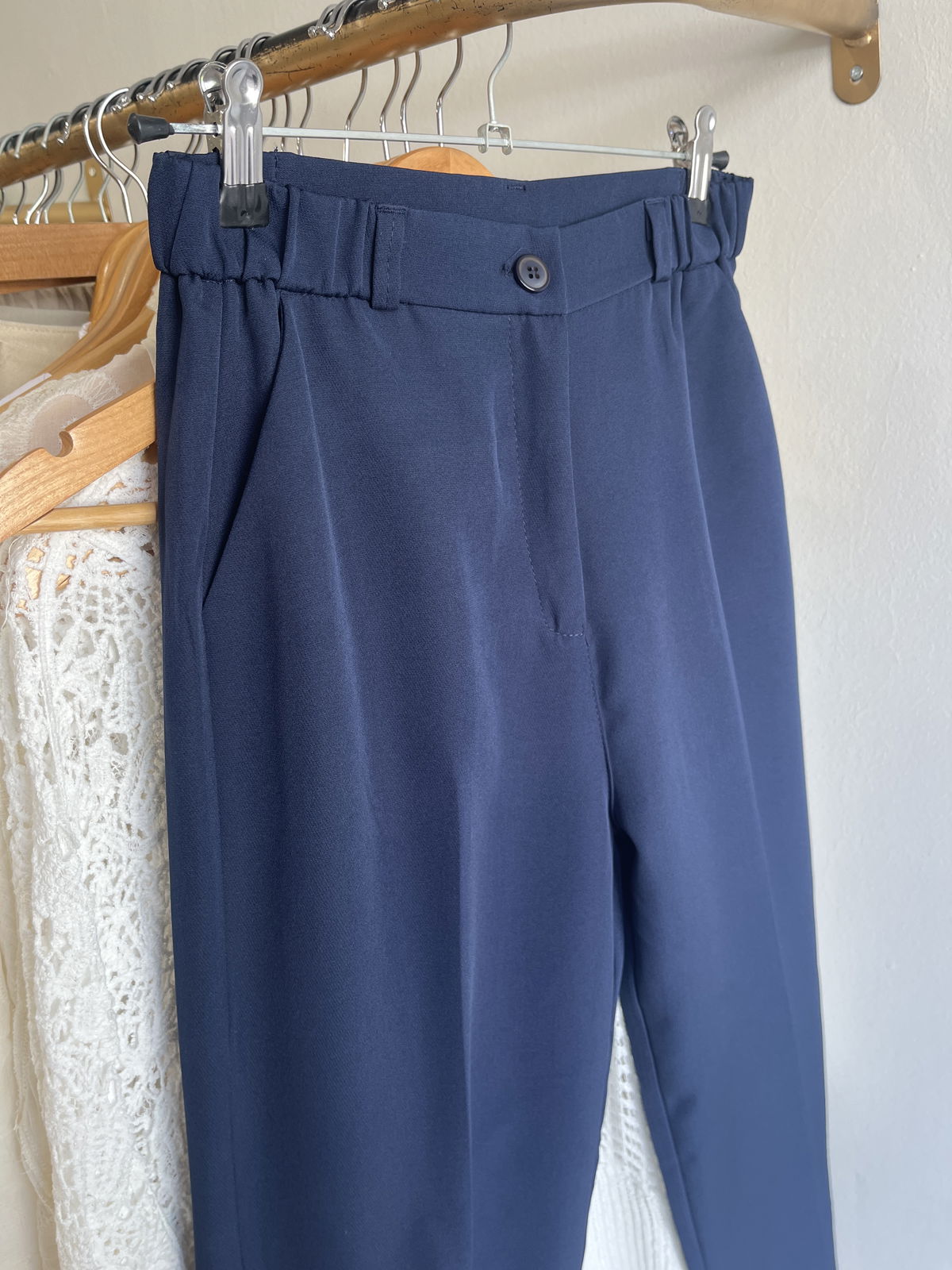 Tiene elástico solo en los laterales y atrás tiene pinzas.