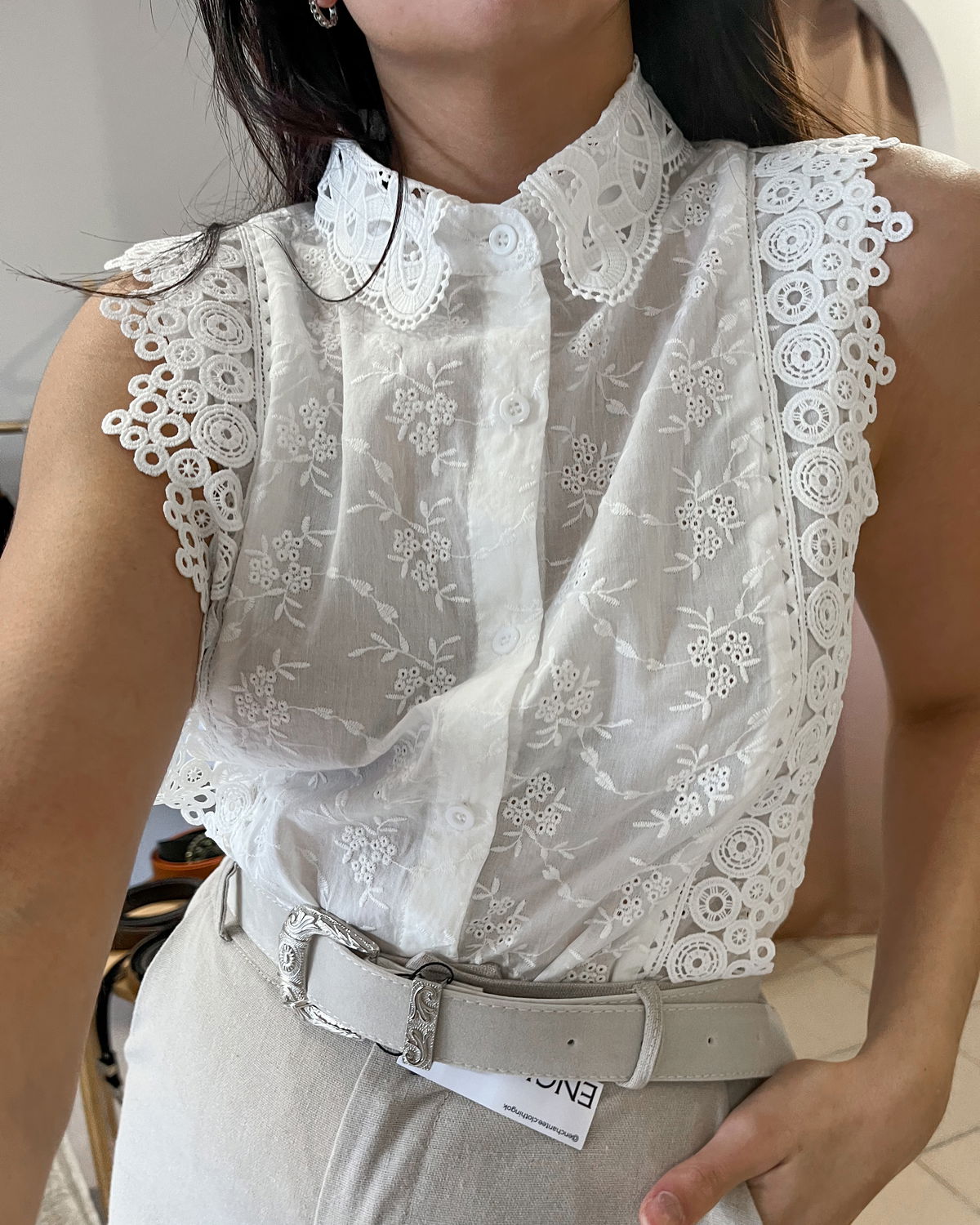 Blusa de broderie con puntilla adelante en cuello. Con botones.