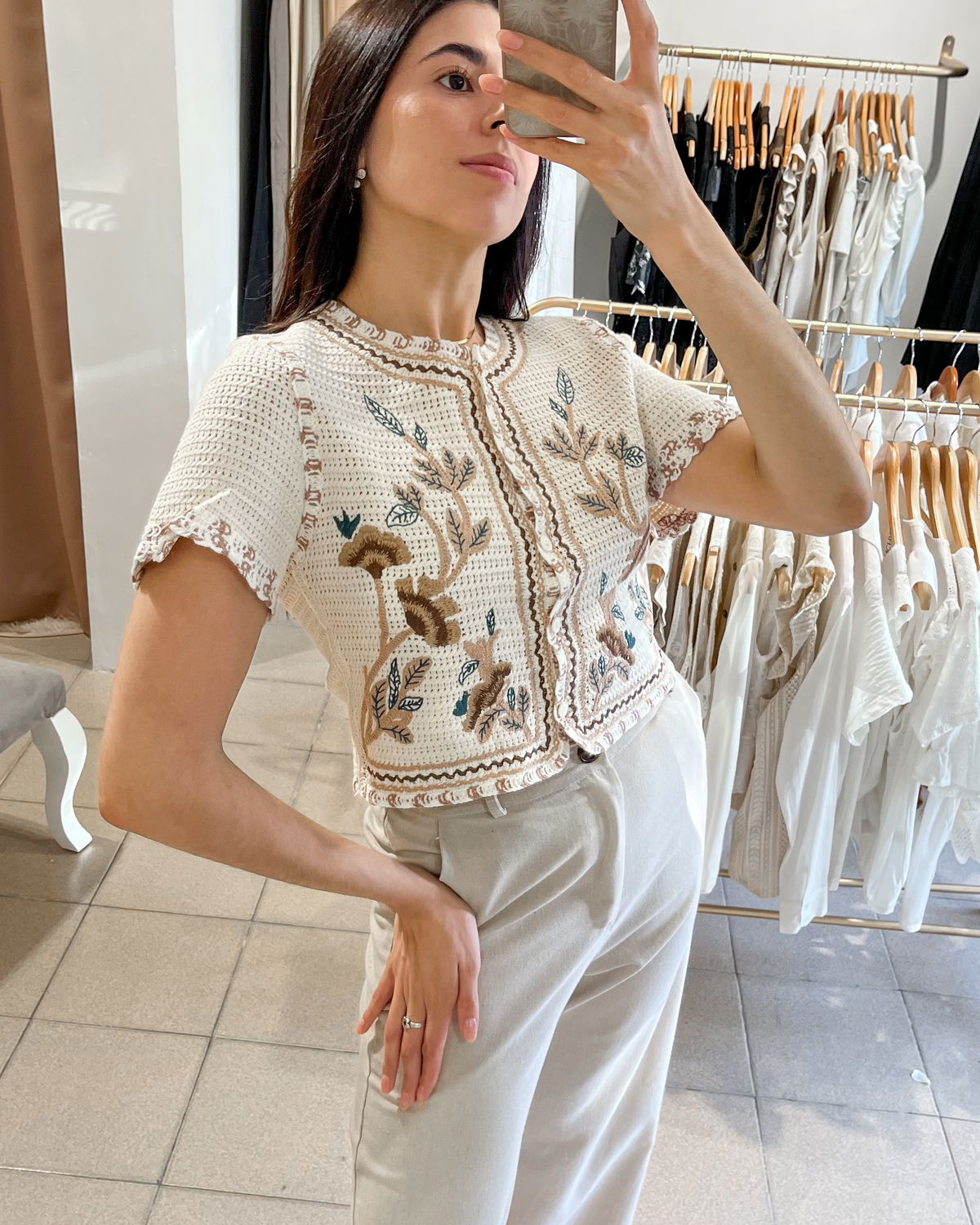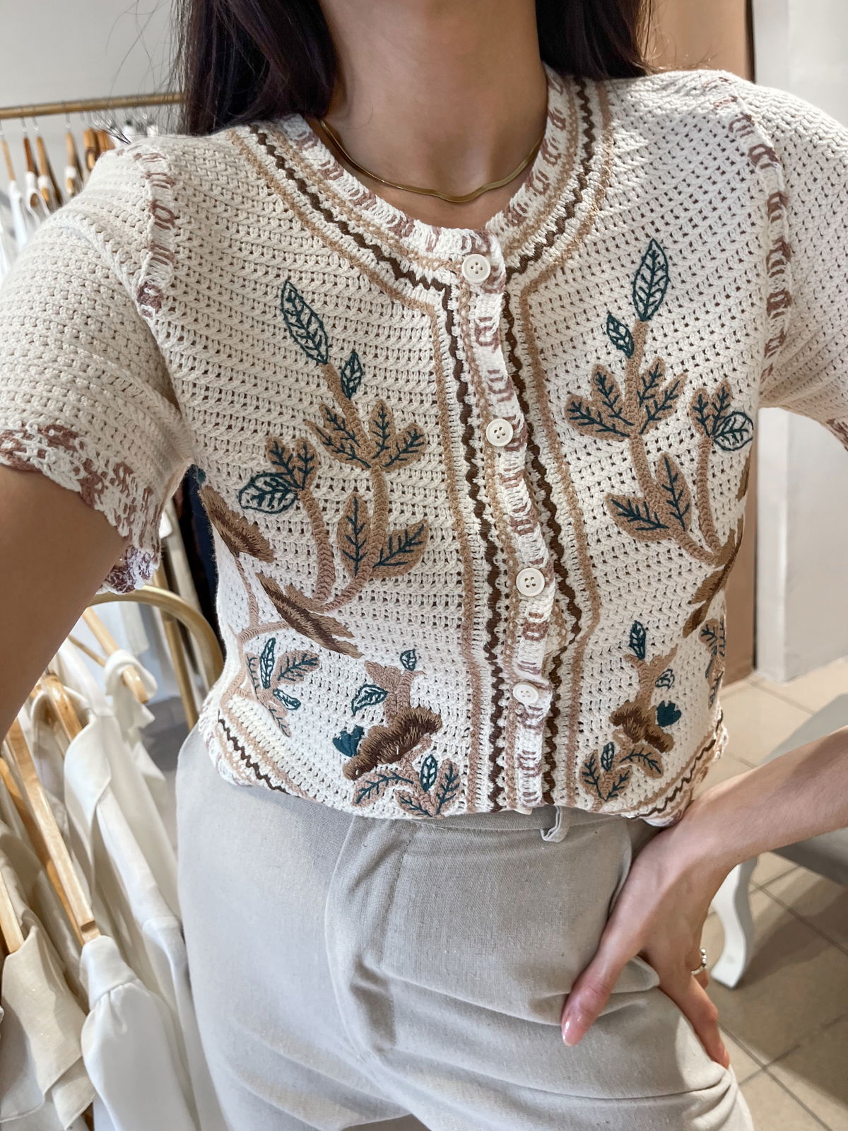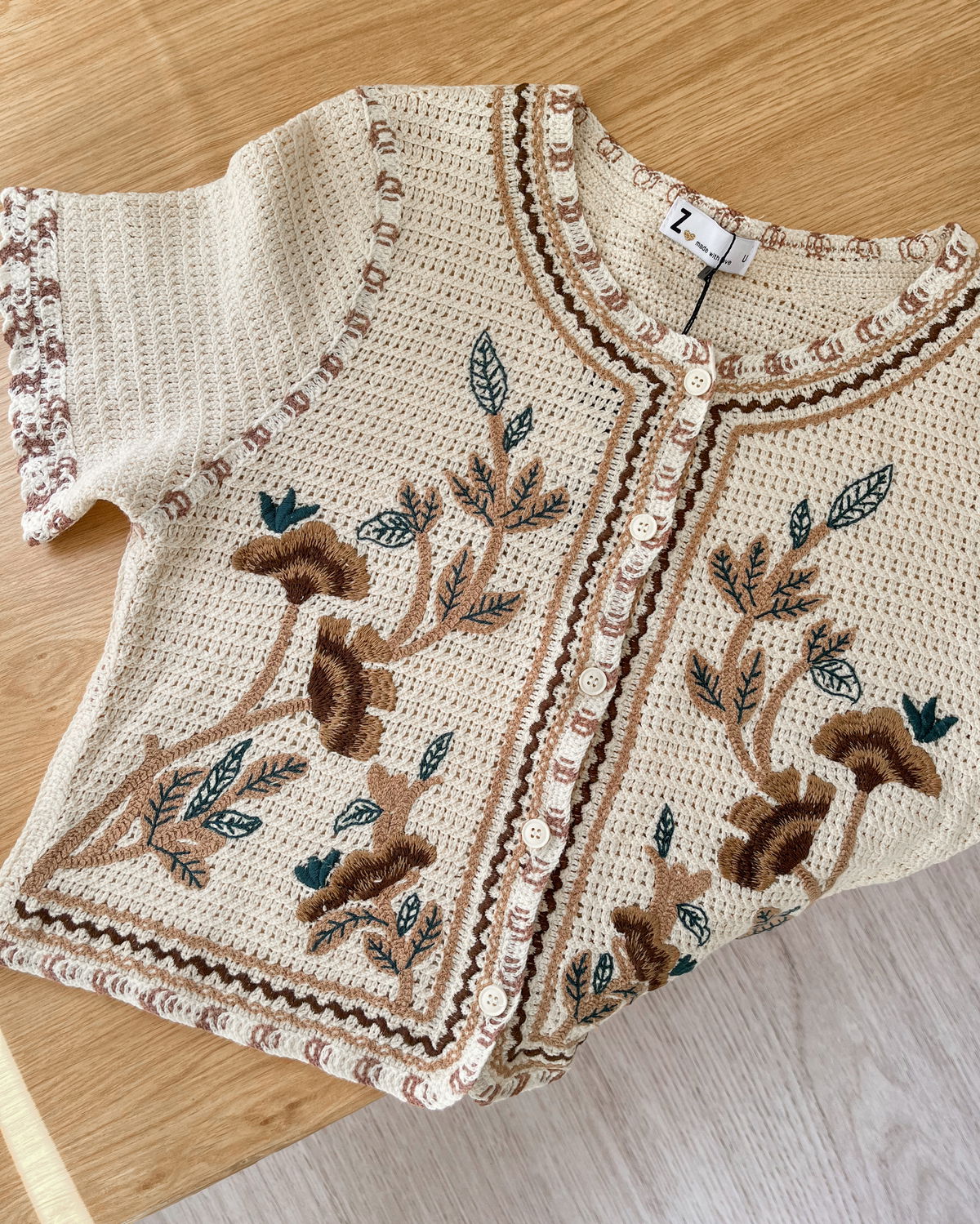 Saco tejido de hilo grueso, bordado, unico color y diseño. Mangas cortas. Con botones