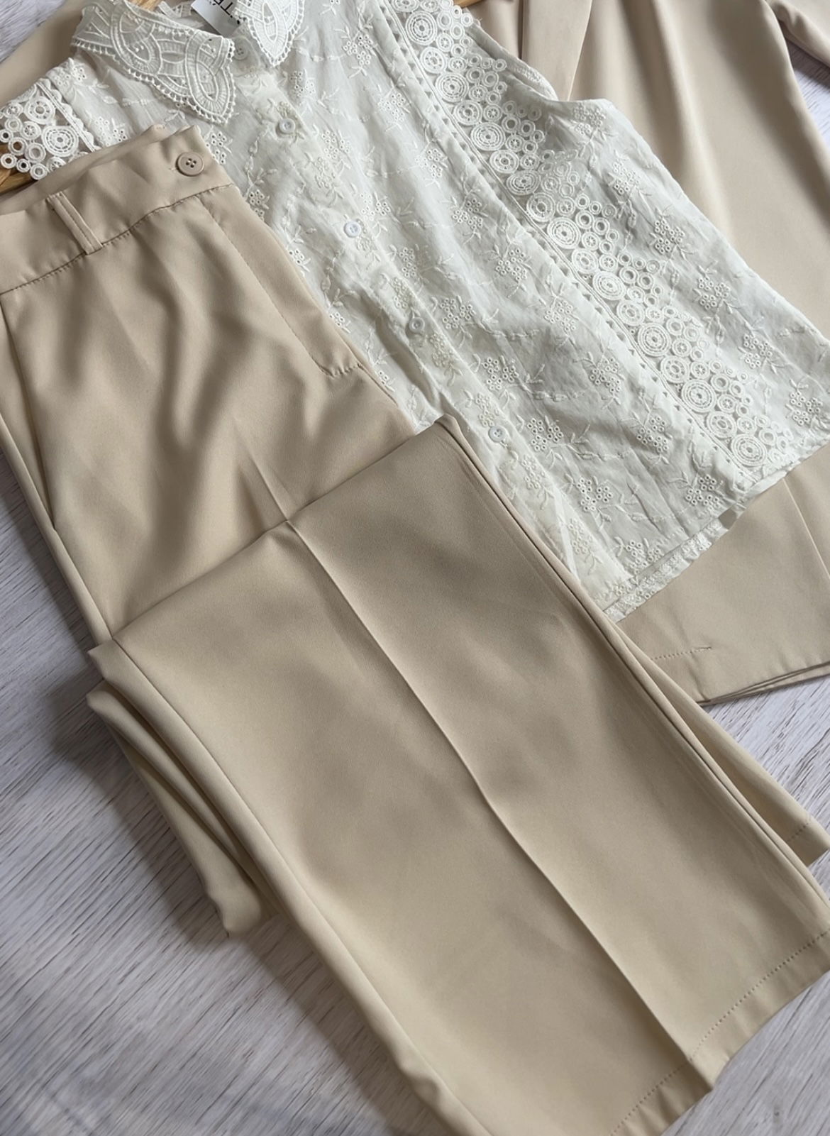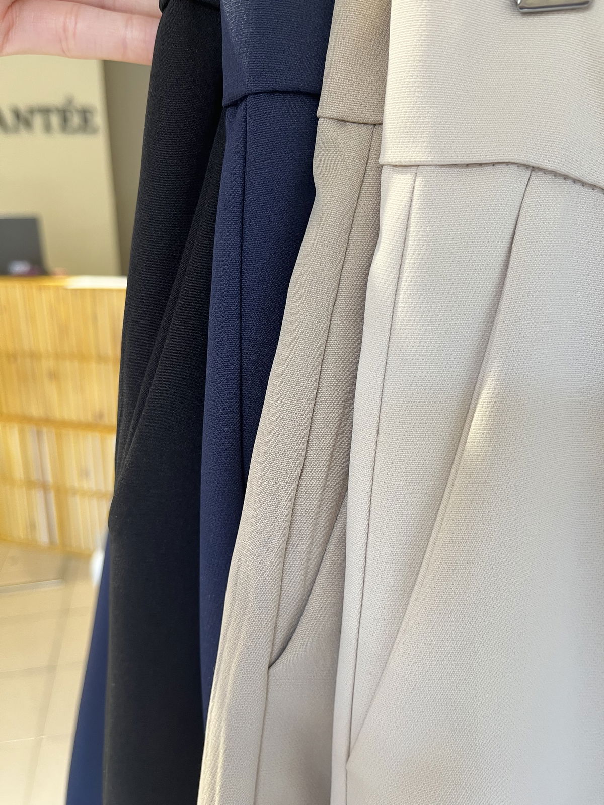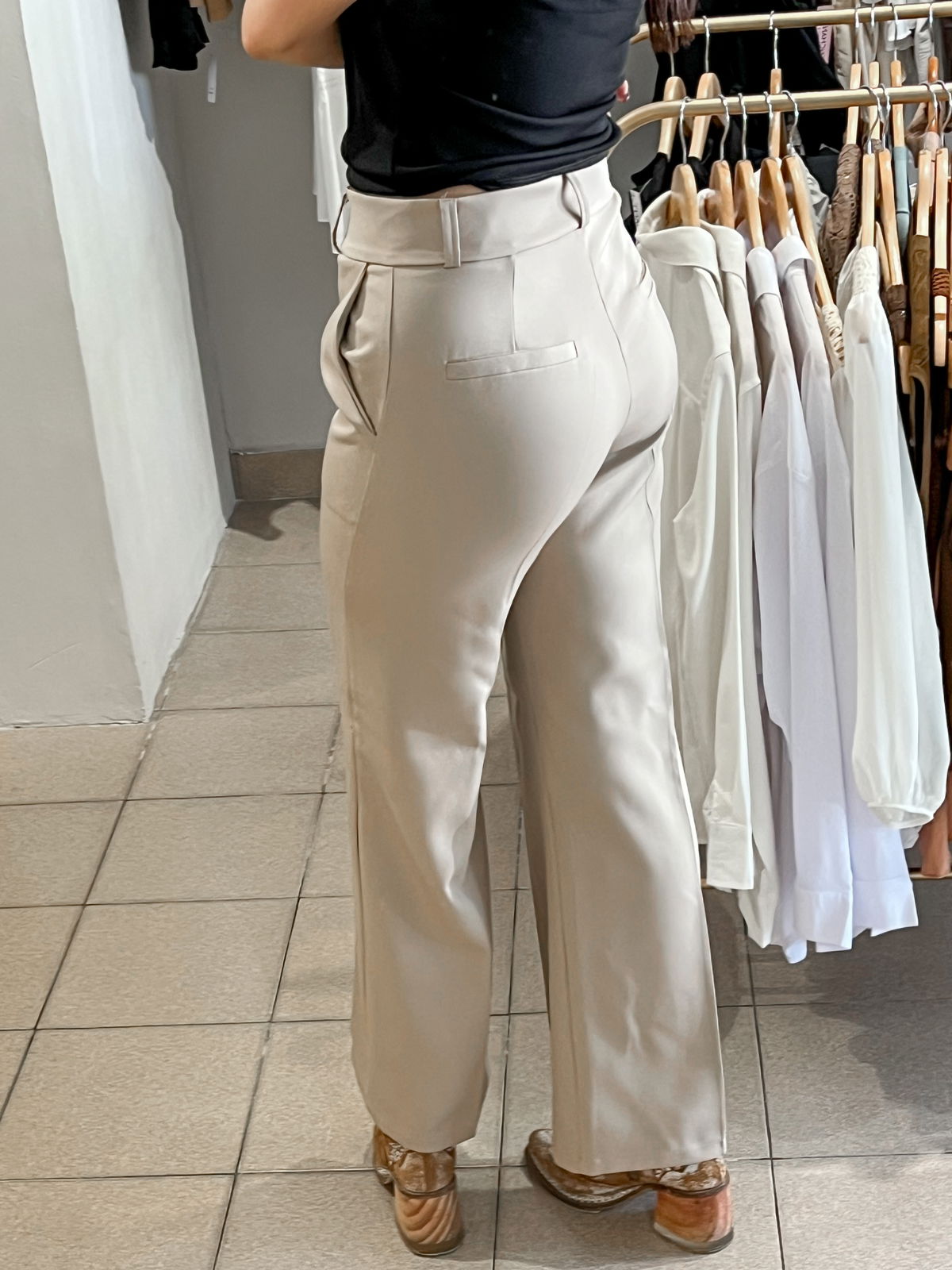 Pantalón sastrero recto con bolsillos delanteros, botón y cierre.