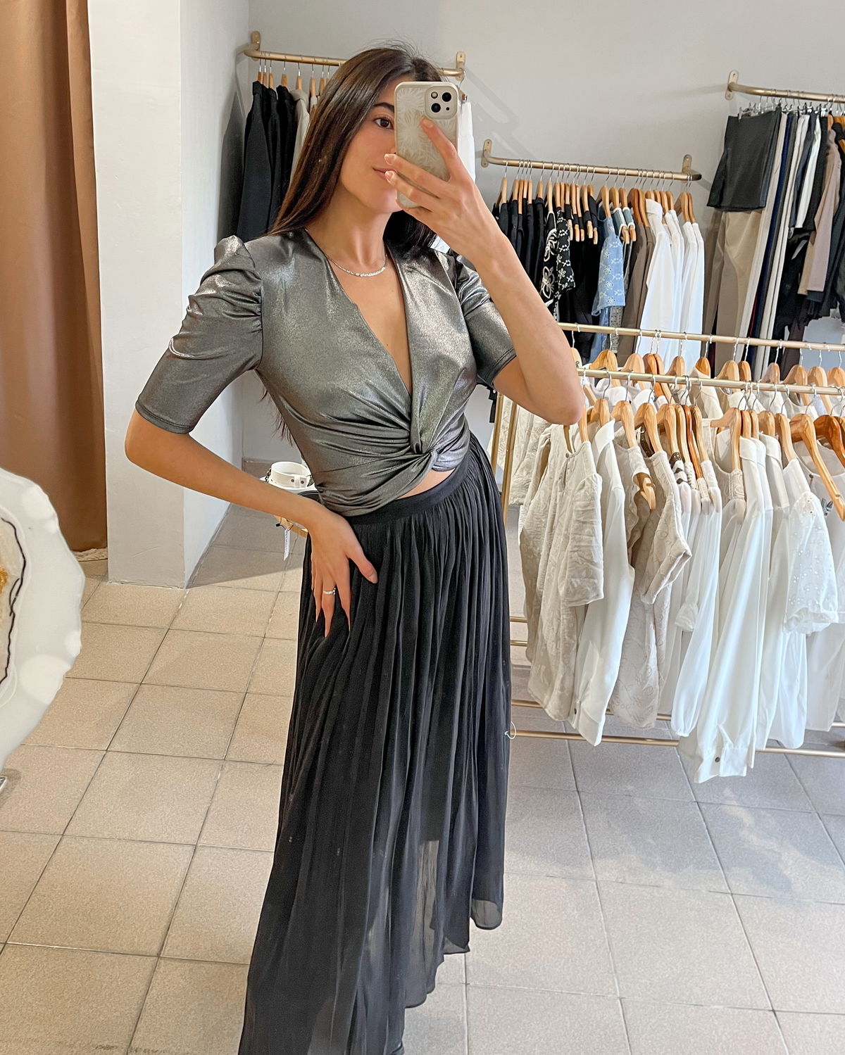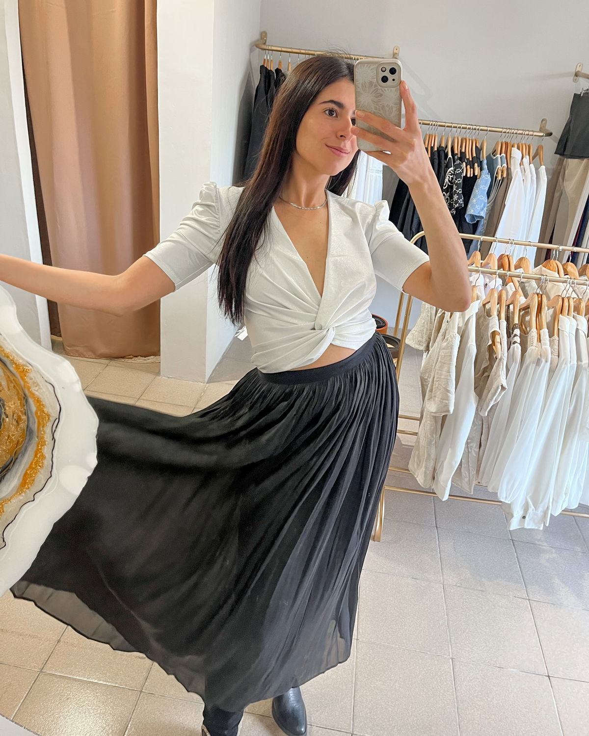 Maxipollera con elastico en cintura. De gasa satinada con forrería interna
